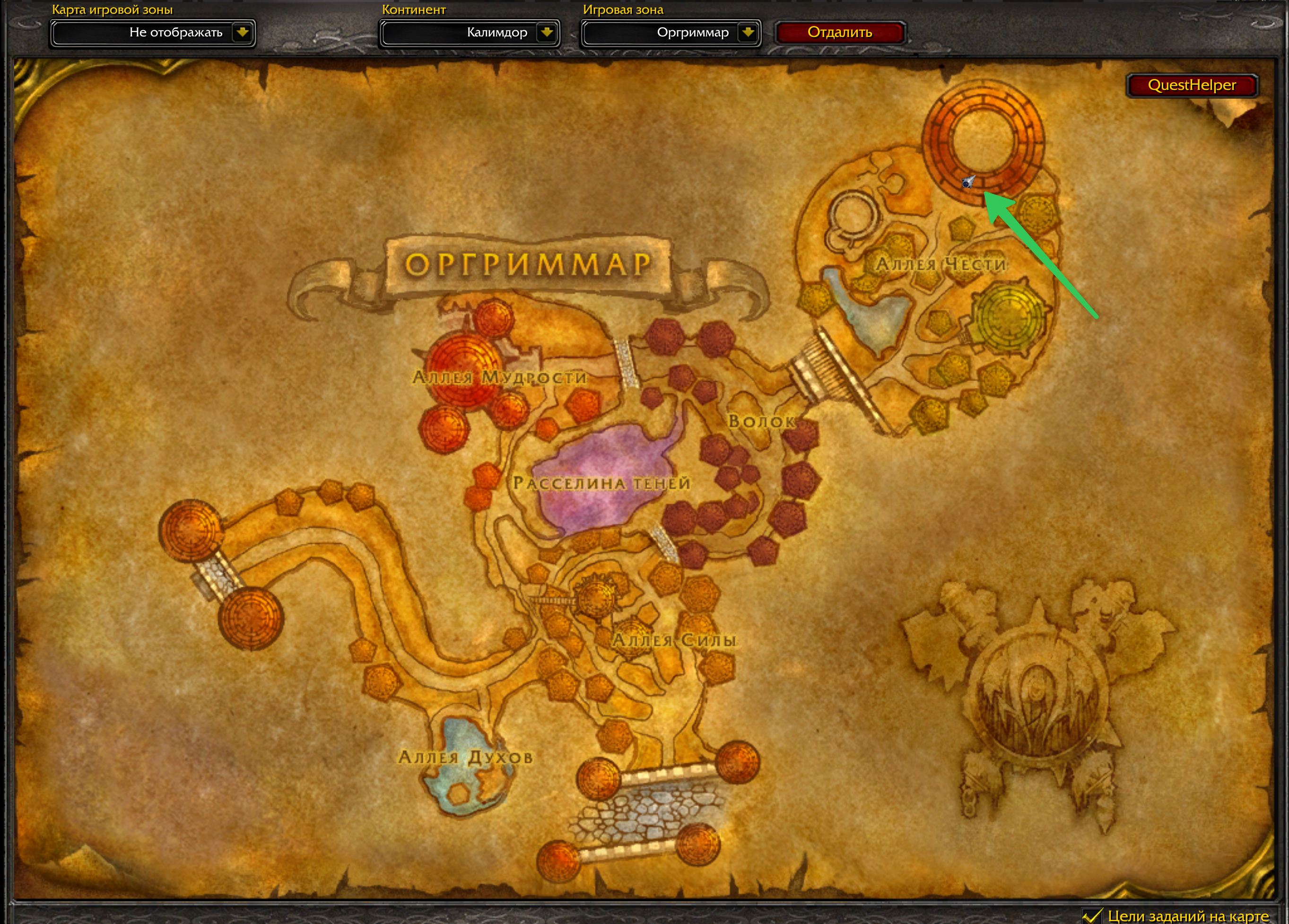 - Оргриммар — рядом с ареной в Аллее Чести